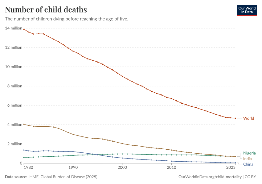 IHME, Global Burden of Disease (2024) – with minor processing by Our World in Data. “Number of child deaths” [dataset]. IHME, Global Burden of Disease, “Global Burden of Disease - Deaths and DALYs” [original data]. Retrieved February 9, 2026 from https://data-lexicalindex-indicators.owid.pages.dev:8789/20250909-093708/grapher/number-of-child-deaths.html (archived on September 9, 2025).