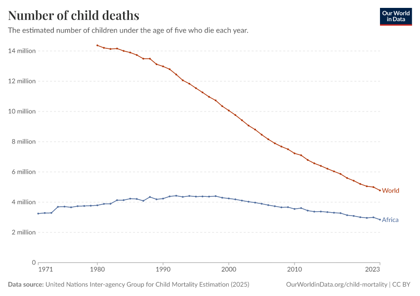 United Nations Inter-agency Group for Child Mortality Estimation (2025) – with minor processing by Our World in Data. “Under-five deaths” [dataset]. United Nations Inter-agency Group for Child Mortality Estimation, “United Nations Inter-agency Group for Child Mortality Estimation”; Various sources, “Population” [original data]. Retrieved February 9, 2026 from https://data-lexicalindex-indicators.owid.pages.dev:8789/20260119-070102/grapher/number-of-child-deaths-igme.html (archived on January 19, 2026).