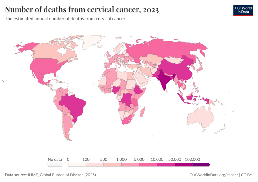 “Data Page: Number of deaths from cervical cancer”, part of the following publication: Esteban Ortiz-Ospina and Max Roser (2016) - “Global Health”. Data adapted from IHME, Global Burden of Disease. Retrieved from https://data-lexicalindex-indicators.owid.pages.dev:8789/20250909-093708/grapher/number-of-deaths-from-cervical-cancer.html [online resource] (archived on September 9, 2025).How to cite this data