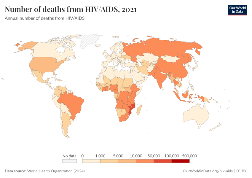 World Health Organization (2024) – with major processing by Our World in Data. “Number of deaths from HIV/AIDS” [dataset]. World Health Organization, “Global Health Estimates” [original data]. Retrieved February 9, 2026 from https://data-lexicalindex-indicators.owid.pages.dev:8789/20250909-093708/grapher/number-of-deaths-from-hivaids-who.html (archived on September 9, 2025).