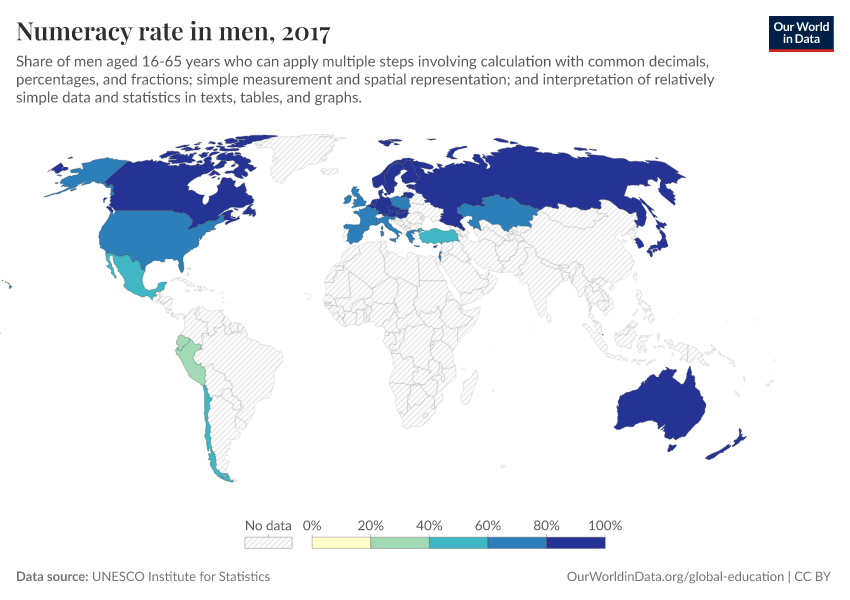 “Data Page: Numeracy rate in men”. Our World in Data (2026). Data adapted from UNESCO Institute for Statistics. Retrieved from https://data-lexicalindex-indicators.owid.pages.dev:8789/20251120-211749/grapher/numeracy-rate-in-adult-men.html [online resource] (archived on November 20, 2025).How to cite this data
