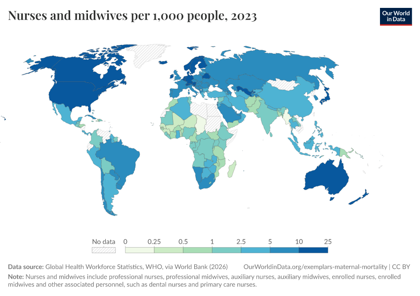 “Data Page: Nurses and midwives per 1,000 people”. Our World in Data (2026). Data adapted from Global Health Workforce Statistics, WHO, via World Bank. Retrieved from https://data-lexicalindex-indicators.owid.pages.dev:8789/20260202-181317/grapher/nurses-and-midwives-per-1000-people.html [online resource] (archived on February 2, 2026).How to cite this data