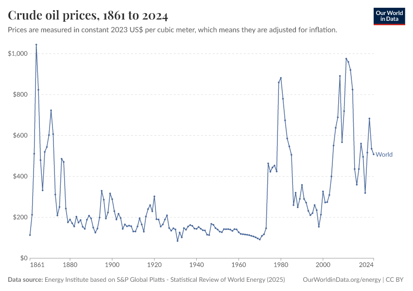 “Data Page: Oil price - Crude prices since 1861”, part of the following publication: Hannah Ritchie, Pablo Rosado, and Max Roser (2023) - “Energy”. Data adapted from Energy Institute. Retrieved from https://data-lexicalindex-indicators.owid.pages.dev:8789/20250909-093708/grapher/oil-prices-inflation-adjusted.html [online resource] (archived on September 9, 2025).How to cite this data