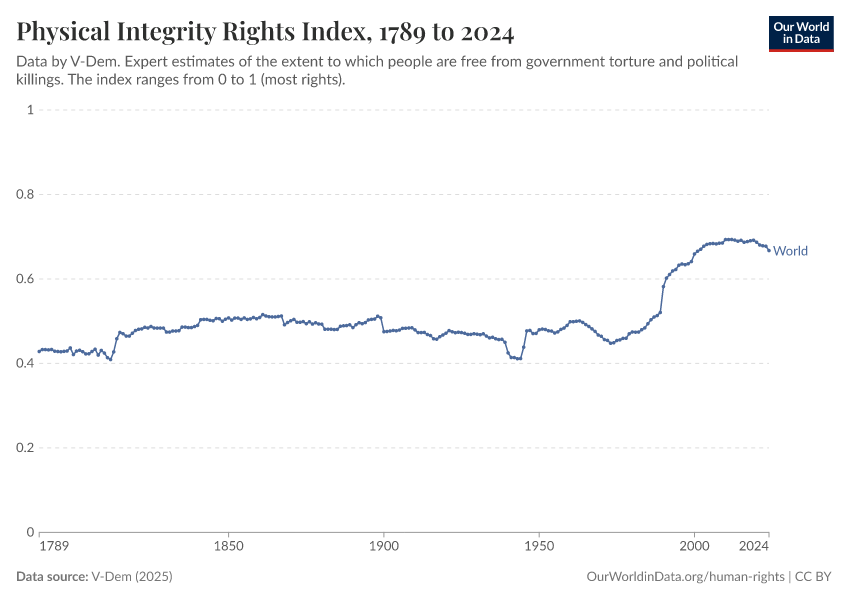 “Data Page: Physical violence index”, part of the following publication: Bastian Herre, Lucas Rodés-Guirao, and Esteban Ortiz-Ospina (2013) - “Democracy”. Data adapted from V-Dem. Retrieved from https://data-lexicalindex-indicators.owid.pages.dev:8789/20260119-070102/grapher/physical-integrity-rights-index-vdem.html [online resource] (archived on January 19, 2026).How to cite this data