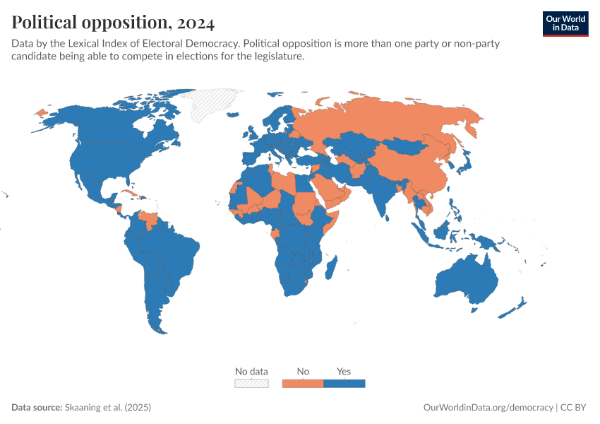 Skaaning et al. (2025) – processed by Our World in Data. “Political opposition” [dataset]. Skaaning et al., “Lexical Index of Electoral Democracy (LIED) v6.8” [original data]. Retrieved February 9, 2026 from https://data-lexicalindex-indicators.owid.pages.dev:8789/20260119-065148/grapher/political-opposition-lexical.html (archived on January 19, 2026).