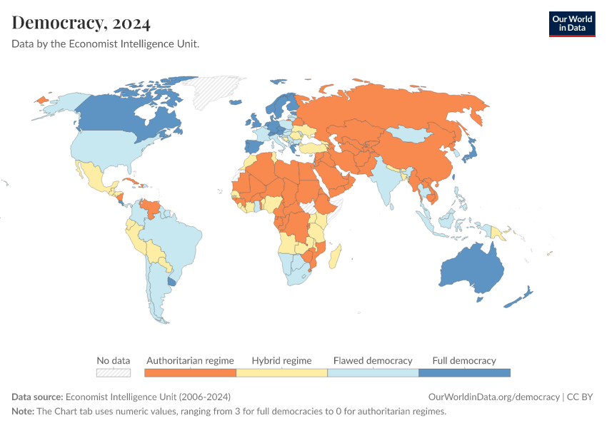 Economist Intelligence Unit (2006-2024) – processed by Our World in Data. “Democracy” [dataset]. Economist Intelligence Unit, “Democracy Index 2021: The China challenge”; Economist Intelligence Unit, “Democracy Index 2022: Frontline democracy and the battle for Ukraine”; Economist Intelligence Unit, “Democracy Index 2023: Age of Conflict”; Economist Intelligence Unit, “Democracy Index 2024: What's wrong with representative democracy?”; Gapminder, “Democracy Index v4” [original data]. Retrieved February 9, 2026 from https://data-lexicalindex-indicators.owid.pages.dev:8789/20260105-133053/grapher/political-regime-eiu.html (archived on January 5, 2026).
