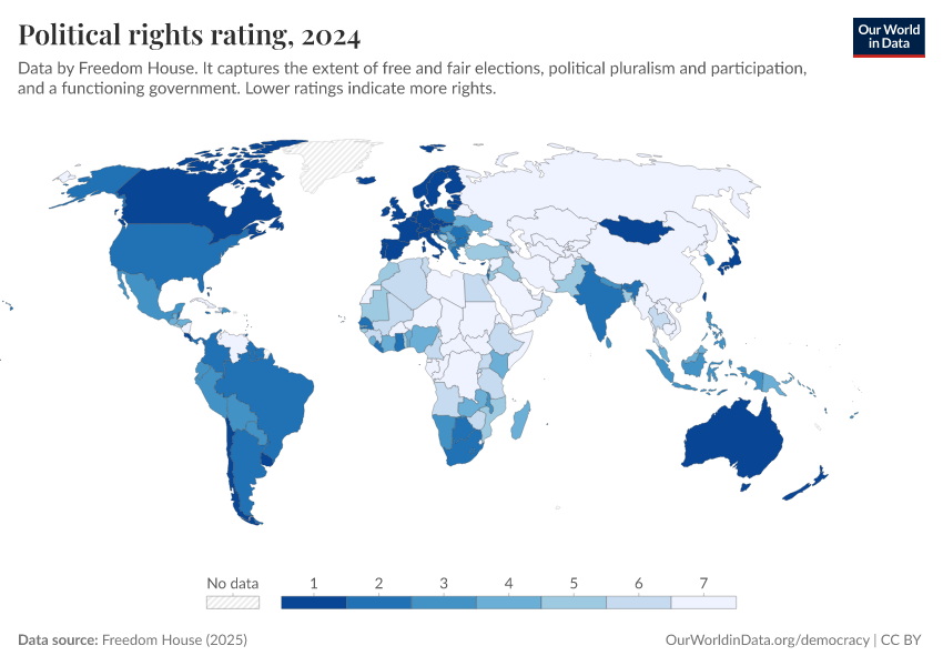 Freedom House (2025) – processed by Our World in Data. “Political rights rating” [dataset]. Freedom House, “Freedom in the World” [original data]. Retrieved February 9, 2026 from https://data-lexicalindex-indicators.owid.pages.dev:8789/20260119-070102/grapher/political-rights-rating-fh.html (archived on January 19, 2026).