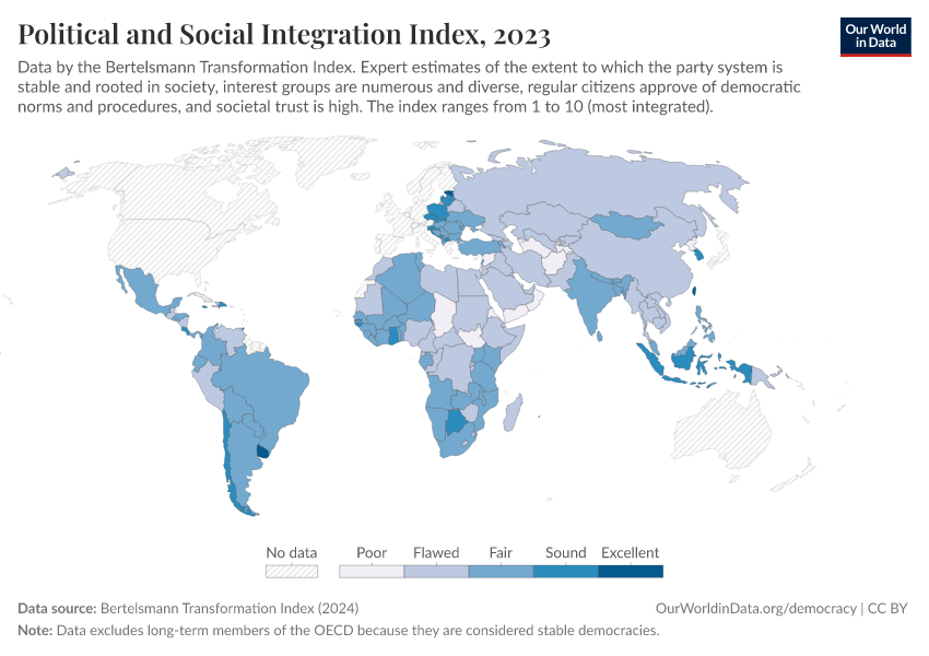 “Data Page: Political and Social Integration Index”, part of the following publication: Bastian Herre, Lucas Rodés-Guirao, and Esteban Ortiz-Ospina (2013) - “Democracy”. Data adapted from Bertelsmann Transformation Index. Retrieved from https://data-lexicalindex-indicators.owid.pages.dev:8789/20260105-133053/grapher/political-social-integration-index-bti.html [online resource] (archived on January 5, 2026).How to cite this data