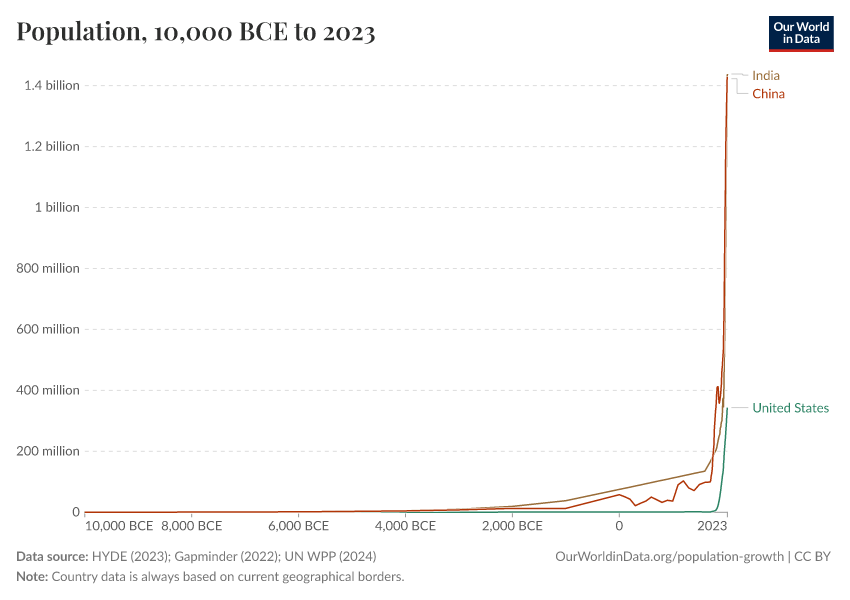 “Data Page: Population”, part of the following publication: Hannah Ritchie, Lucas Rodés-Guirao, Edouard Mathieu, Marcel Gerber, Esteban Ortiz-Ospina, Joe Hasell, and Max Roser (2023) - “Population Growth”. Data adapted from PBL Netherlands Environmental Assessment Agency, Gapminder, United Nations. Retrieved from https://data-lexicalindex-indicators.owid.pages.dev:8789/20260119-065148/grapher/population.html [online resource] (archived on January 19, 2026).