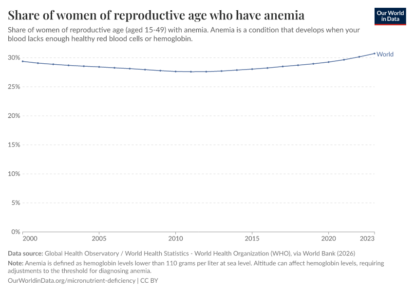 “Data Page: Share of women of reproductive age who have anemia”. Our World in Data (2026). Data adapted from Global Health Observatory / World Health Statistics - World Health Organization (WHO), via World Bank. Retrieved from https://data-lexicalindex-indicators.owid.pages.dev:8789/20260202-181317/grapher/prevalence-of-anemia-in-women-of-reproductive-age-aged-15-29.html [online resource] (archived on February 2, 2026).How to cite this data