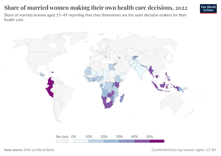 “Data Page: Share of married women making their own health care decisions”, part of the following publication: Bastian Herre, Veronika Samborska, Pablo Arriagada, and Hannah Ritchie (2023) - “Women’s Rights”. Data adapted from World Bank Gender Statistics. Retrieved from https://data-lexicalindex-indicators.owid.pages.dev:8789/20250916-204433/grapher/proportion-of-women-who-make-their-own-informed-health-care-decisions.html [online resource] (archived on September 16, 2025).How to cite this data
