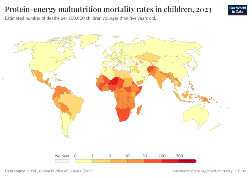 IHME, Global Burden of Disease (2024) – with minor processing by Our World in Data. “Protein-energy malnutrition mortality rates in children ” [dataset]. IHME, Global Burden of Disease, “Global Burden of Disease - Deaths and DALYs” [original data]. Retrieved February 9, 2026 from https://data-lexicalindex-indicators.owid.pages.dev:8789/20250909-093708/grapher/protein-energy-malnutrition-mortality-rates-in-children.html (archived on September 9, 2025).