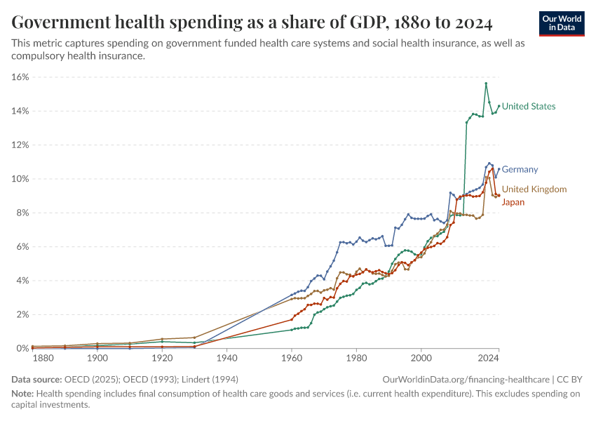 OECD (2025); OECD (1993); Lindert (1994) – with major processing by Our World in Data. “Public health expenditure as a share of GDP – Lindert, OECD – Historical data” [dataset]. OECD, “OECD Health Expenditure and Financing Database”; OECD, “OECD Health Systems”; Lindert, “The rise of social spending (1880-1930)” [original data]. Retrieved February 9, 2026 from https://data-lexicalindex-indicators.owid.pages.dev:8789/20251211-191143/grapher/public-health-expenditure-share-gdp.html (archived on December 11, 2025).