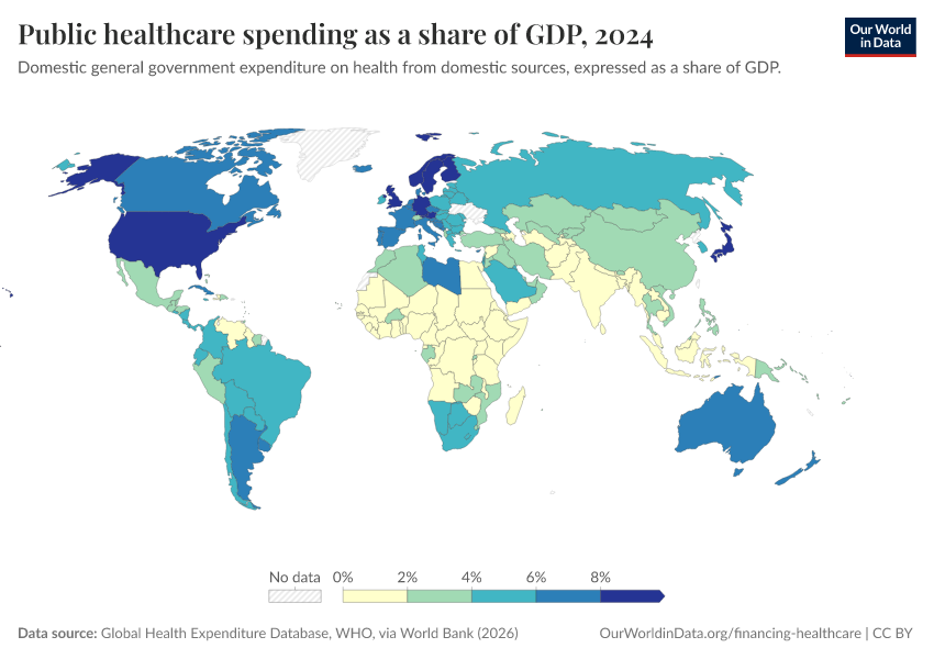 “Data Page: Public healthcare spending as a share of GDP”. Our World in Data (2026). Data adapted from Global Health Expenditure Database, WHO, via World Bank. Retrieved from https://data-lexicalindex-indicators.owid.pages.dev:8789/20260202-181317/grapher/public-healthcare-spending-share-gdp.html [online resource] (archived on February 2, 2026).How to cite this data