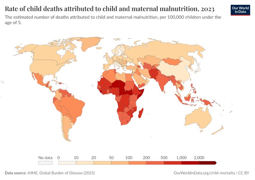 IHME, Global Burden of Disease (2024) – with minor processing by Our World in Data. “Rate of child deaths attributed to child and maternal malnutrition” [dataset]. IHME, Global Burden of Disease, “Global Burden of Disease - Risk Factors” [original data]. Retrieved February 9, 2026 from https://data-lexicalindex-indicators.owid.pages.dev:8789/20250909-093708/grapher/rate-of-child-deaths-attributed-to-child-and-maternal-malnutrition.html (archived on September 9, 2025).