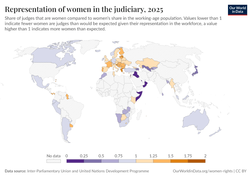 “Data Page: Representation of women in the judiciary”. Our World in Data (2026). Data adapted from Inter-Parliamentary Union and United Nations Development Programme. Retrieved from https://data-lexicalindex-indicators.owid.pages.dev:8789/20260105-133053/grapher/representation-of-women-in-the-judiciary.html [online resource] (archived on January 5, 2026).How to cite this data