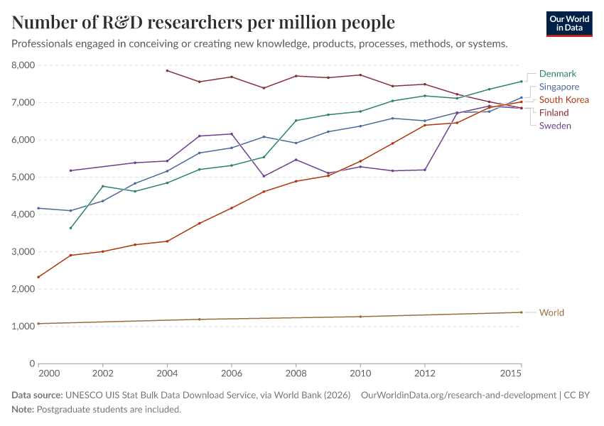 “Data Page: Number of R&D researchers per million people”. Our World in Data (2026). Data adapted from UNESCO UIS Stat Bulk Data Download Service, via World Bank. Retrieved from https://data-lexicalindex-indicators.owid.pages.dev:8789/20260202-181317/grapher/researchers-in-rd-per-million-people.html [online resource] (archived on February 2, 2026).