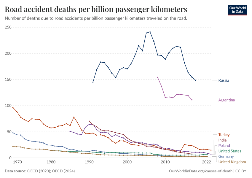 “Data Page: Road accident deaths per billion passenger kilometers”, part of the following publication: Hannah Ritchie and Max Roser (2021) - “Transport”. Data adapted from OECD. Retrieved from https://data-lexicalindex-indicators.owid.pages.dev:8789/20250909-093708/grapher/road-accident-deaths-per-passenger-kilometers.html [online resource] (archived on September 9, 2025).How to cite this data