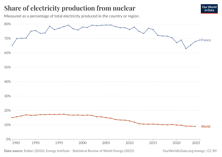 Ember (2026); Energy Institute - Statistical Review of World Energy (2025) – with major processing by Our World in Data. “Share of electricity generated by nuclear power” [dataset]. Ember, “Yearly Electricity Data Europe”; Ember, “Yearly Electricity Data”; Energy Institute, “Statistical Review of World Energy” [original data]. Retrieved February 9, 2026 from https://data-lexicalindex-indicators.owid.pages.dev:8789/20260203-171503/grapher/share-electricity-nuclear.html (archived on February 3, 2026).