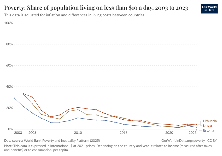 World Bank Poverty and Inequality Platform (2025) – with major processing by Our World in Data. “Poverty: Share of population living on less than $10 a day – World Bank” [dataset]. World Bank Poverty and Inequality Platform, “World Bank Poverty and Inequality Platform (PIP) 20250930_2021, 20250930_2017” [original data]. Retrieved February 9, 2026 from https://data-lexicalindex-indicators.owid.pages.dev:8789/20260127-114142/grapher/share-living-with-less-than-10-int--per-day.html (archived on January 27, 2026).