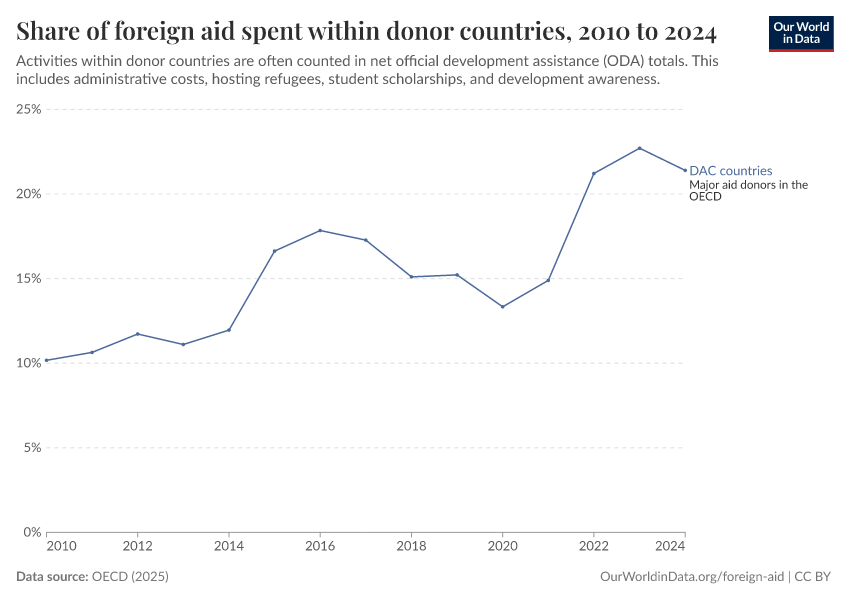 OECD (2025) – with minor processing by Our World in Data. “Share of foreign aid spent within donor countries – Net disbursements” [dataset]. OECD, “OECD Official Development Assistance (ODA) - DAC1: Flows by provider (ODA+OOF+Private)” [original data]. Retrieved February 9, 2026 from https://data-lexicalindex-indicators.owid.pages.dev:8789/20251230-141326/grapher/share-of-foreign-aid-spent-within-donor-countries.html (archived on December 30, 2025).