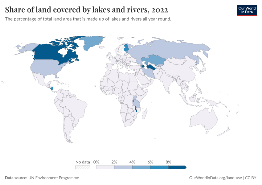 “Data Page: Share of land covered by lakes and rivers”. Our World in Data (2026). Data adapted from UN Environment Programme. Retrieved from https://data-lexicalindex-indicators.owid.pages.dev:8789/20260130-180113/grapher/share-of-land-covered-by-lakes-and-rivers.html [online resource] (archived on January 30, 2026).How to cite this data