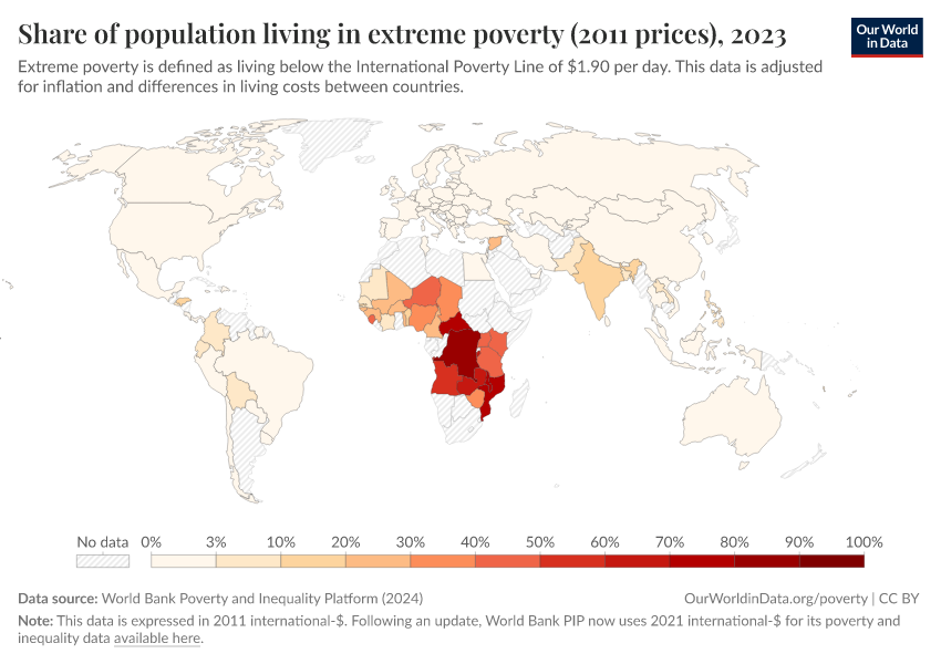 World Bank Poverty and Inequality Platform (2024) – with major processing by Our World in Data. “Share of population living in extreme poverty (2011 prices) – World Bank” [dataset]. World Bank Poverty and Inequality Platform, “World Bank Poverty and Inequality Platform (PIP) 20240627_2017, 20240627_2011” [original data]. Retrieved February 9, 2026 from https://data-lexicalindex-indicators.owid.pages.dev:8789/20251022-091218/grapher/share-of-population-in-extreme-poverty-2011-ppp.html (archived on October 22, 2025).
