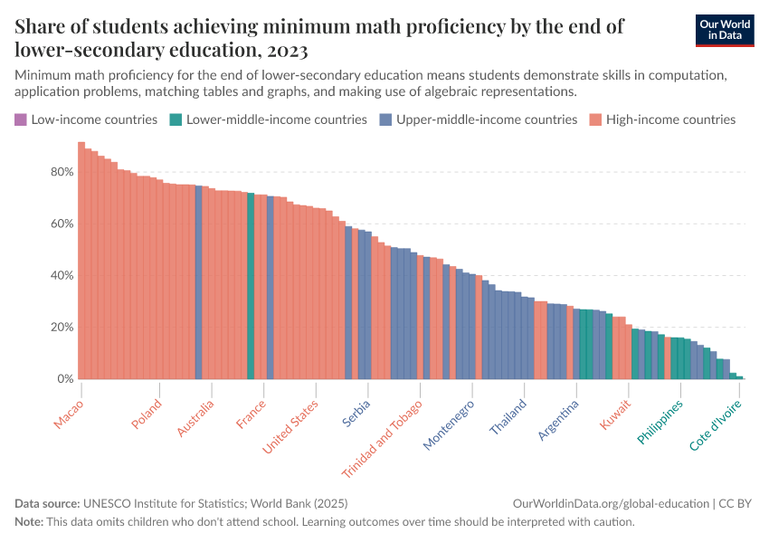 “Data Page: Share of students achieving minimum math proficiency by the end of lower-secondary education”. Our World in Data (2026). Data adapted from UNESCO Institute for Statistics. Retrieved from https://data-lexicalindex-indicators.owid.pages.dev:8789/20260130-180113/grapher/share-of-students-at-end-of-lower-secondary-education-achieving-minimum-math-proficiency.html [online resource] (archived on January 30, 2026).How to cite this data