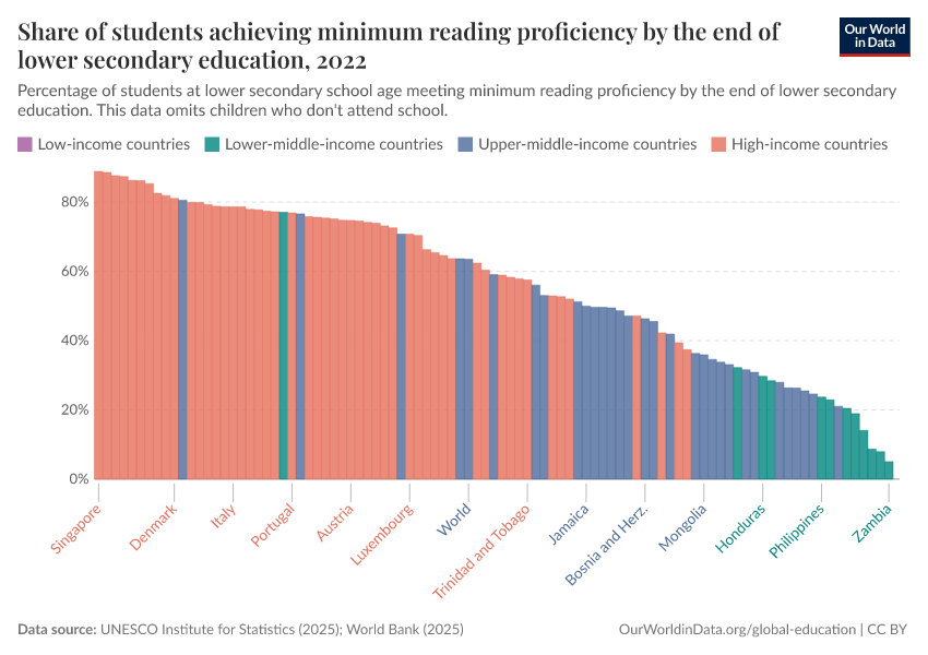 UNESCO Institute for Statistics (2025) – with minor processing by Our World in Data. “Share of students achieving minimum reading proficiency by the end of lower secondary education” [dataset]. UNESCO Institute for Statistics, “UNESCO Institute for Statistics (UIS) - Education” [original data]. Retrieved February 9, 2026 from https://data-lexicalindex-indicators.owid.pages.dev:8789/20260122-091445/grapher/share-of-students-at-end-of-lower-secondary-education-with-minimum-reading-proficiency.html (archived on January 22, 2026).