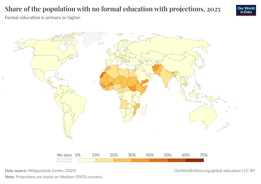 “Data Page: Share of the population with no formal education with projections”, part of the following publication: Hannah Ritchie, Veronika Samborska, Esteban Ortiz-Ospina, and Max Roser (2023) - “Global Education”. Data adapted from Wittgenstein Centre. Retrieved from https://data-lexicalindex-indicators.owid.pages.dev:8789/20250909-093708/grapher/share-of-the-population-with-no-formal-education-with-projections.html [online resource] (archived on September 9, 2025).How to cite this data