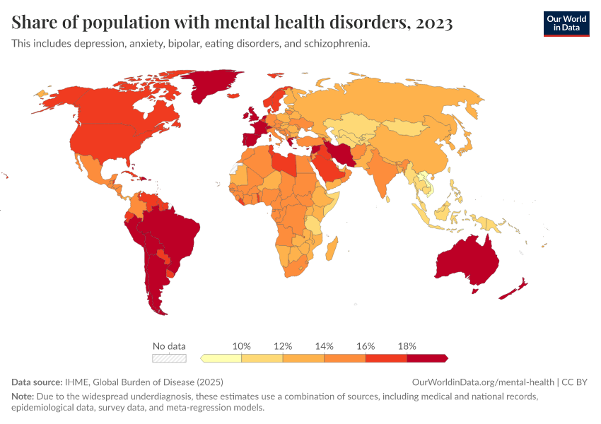 “Data Page: Share of population with mental health disorders”, part of the following publication: Esteban Ortiz-Ospina and Max Roser (2016) - “Global Health”. Data adapted from IHME, Global Burden of Disease. Retrieved from https://data-lexicalindex-indicators.owid.pages.dev:8789/20260105-133053/grapher/share-with-mental-and-substance-disorders.html [online resource] (archived on January 5, 2026).How to cite this data