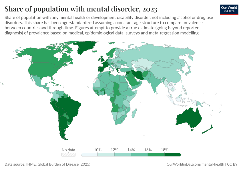 IHME, Global Burden of Disease (2024) – with major processing by Our World in Data. “Share of population with mental disorder” [dataset]. IHME, Global Burden of Disease, “Global Burden of Disease - Mental Health Prevalence” [original data]. Retrieved February 9, 2026 from https://data-lexicalindex-indicators.owid.pages.dev:8789/20250909-093708/grapher/share-with-mental-health-or-development-disorder.html (archived on September 9, 2025).