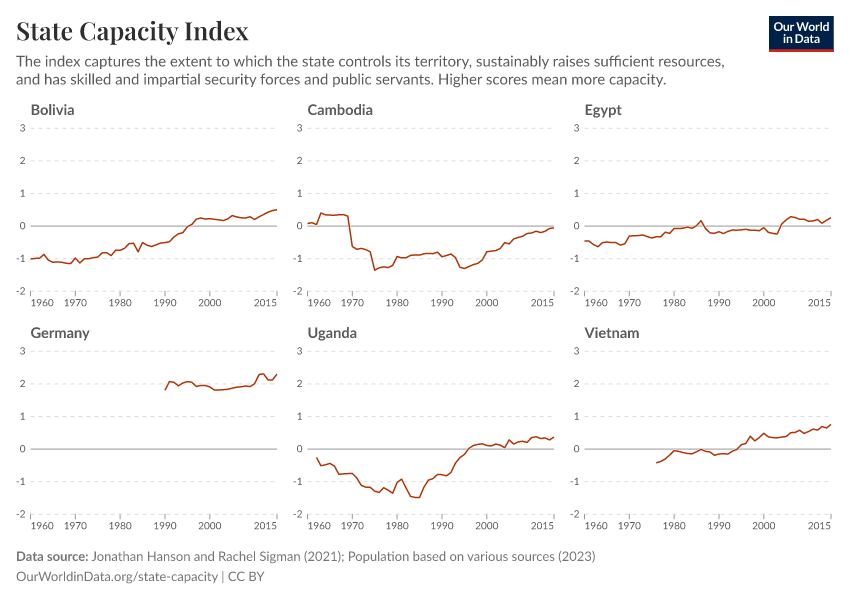 “Data Page: State Capacity Index”, part of the following publication: Bastian Herre and Pablo Arriagada (2023) - “State Capacity”. Data adapted from Jonathan Hanson and Rachel Sigman, Various sources. Retrieved from https://data-lexicalindex-indicators.owid.pages.dev:8789/20260105-133053/grapher/state-capacity-index.html [online resource] (archived on January 5, 2026).How to cite this data