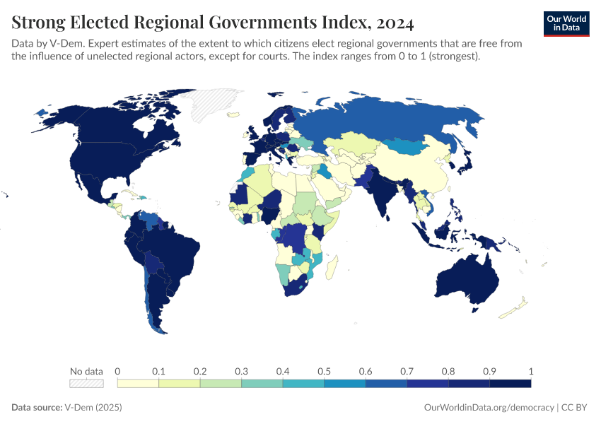 “Data Page: Elected regional governments”, part of the following publication: Bastian Herre, Lucas Rodés-Guirao, and Esteban Ortiz-Ospina (2013) - “Democracy”. Data adapted from V-Dem. Retrieved from https://data-lexicalindex-indicators.owid.pages.dev:8789/20260119-070102/grapher/strong-elected-regional-governments-index.html [online resource] (archived on January 19, 2026).How to cite this data