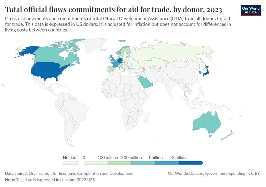 “Data Page: Total official flows commitments for aid for trade, by donor”. Our World in Data (2026). Data adapted from Organisation for Economic Co-operation and Development. Retrieved from https://data-lexicalindex-indicators.owid.pages.dev:8789/20251120-211038/grapher/total-oda-for-aid-for-trade-by-donor.html [online resource] (archived on November 20, 2025).How to cite this data