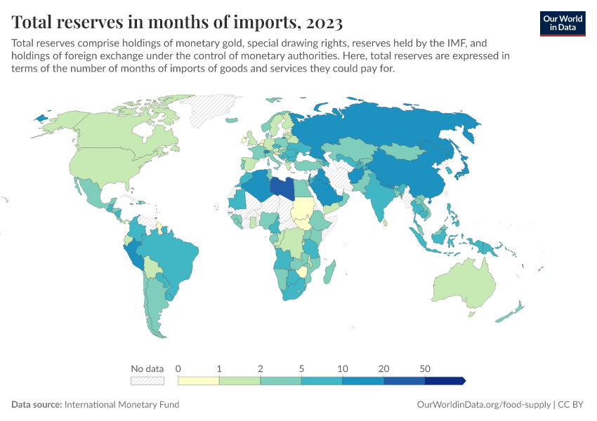 “Data Page: Total reserves in months of imports”. Our World in Data (2026). Data adapted from International Monetary Fund. Retrieved from https://data-lexicalindex-indicators.owid.pages.dev:8789/20260130-180113/grapher/total-reserves-in-months-of-imports.html [online resource] (archived on January 30, 2026).How to cite this data