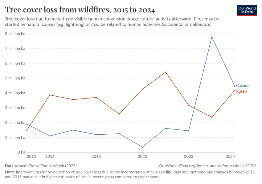 Global Forest Watch (2025) – with major processing by Our World in Data. “Tree cover loss from wildfires” [dataset]. Global Forest Watch, “Tree Cover Loss by Dominant Driver” [original data]. Retrieved February 9, 2026 from https://data-lexicalindex-indicators.owid.pages.dev:8789/20260119-065148/grapher/tree-cover-loss-from-wildfires.html (archived on January 19, 2026).