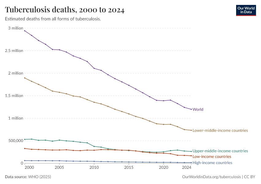 WHO (2025) – with minor processing by Our World in Data. “Tuberculosis deaths” [dataset]. WHO, “Global Tuberculosis Report - Burden Estimates” [original data]. Retrieved February 9, 2026 from https://data-lexicalindex-indicators.owid.pages.dev:8789/20260205-170810/grapher/tuberculosis-deaths-who.html (archived on February 5, 2026).