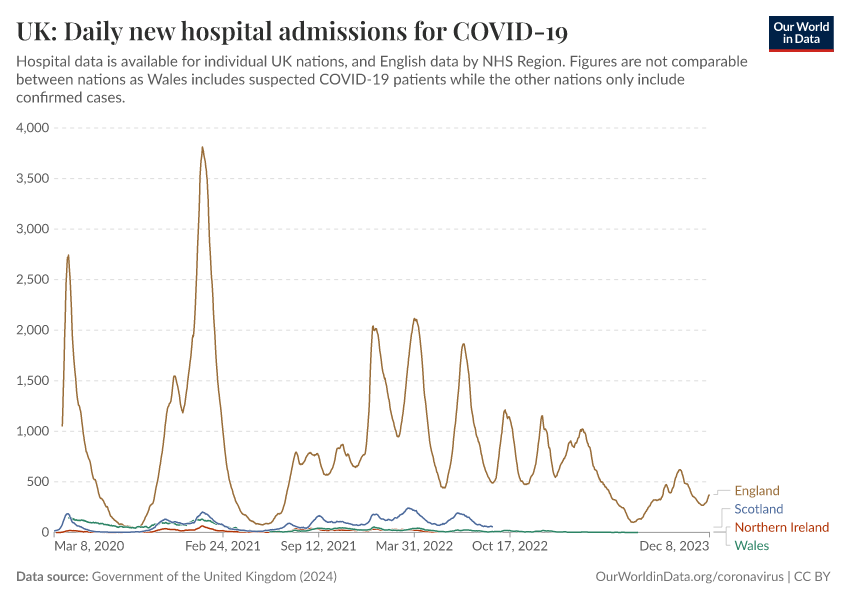 Government of the United Kingdom (2024) – with minor processing by Our World in Data. “UK: Daily new hospital admissions for COVID-19” [dataset]. Government of the United Kingdom, “UKHSA data dashboard” [original data]. Retrieved February 9, 2026 from https://data-lexicalindex-indicators.owid.pages.dev:8789/20250909-093708/grapher/uk-daily-covid-admissions.html (archived on September 9, 2025).
