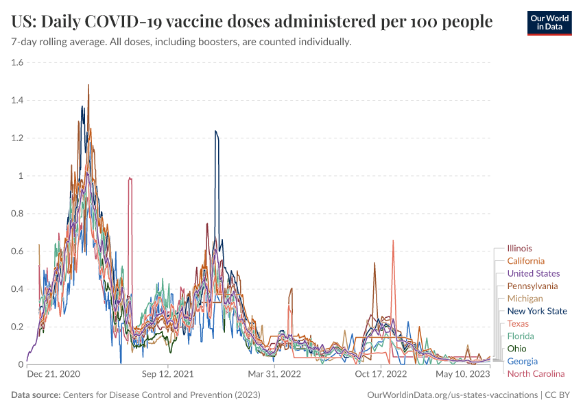 Centers for Disease Control and Prevention (2023) – processed by Our World in Data. “US: Daily COVID-19 vaccine doses administered per 100 people” [dataset]. Centers for Disease Control and Prevention, “COVID-19, Vaccinations (United States)” [original data]. Retrieved February 9, 2026 from https://data-lexicalindex-indicators.owid.pages.dev:8789/20250909-093708/grapher/us-daily-covid-vaccine-doses-per-100.html (archived on September 9, 2025).