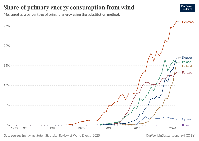 Energy Institute - Statistical Review of World Energy (2025) – with major processing by Our World in Data. “Share of primary energy consumption that comes from wind power – Using the substitution method” [dataset]. Energy Institute, “Statistical Review of World Energy” [original data]. Retrieved February 9, 2026 from https://data-lexicalindex-indicators.owid.pages.dev:8789/20260119-070102/grapher/wind-share-energy.html (archived on January 19, 2026).