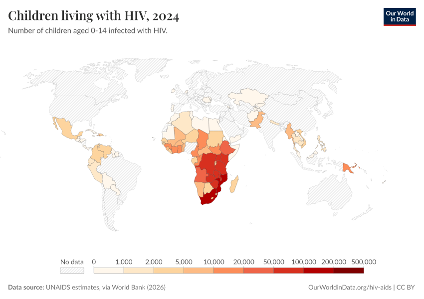 The map shows the total number of children newly infected with HIV yearly. Globally — with similar trends at national levels — the number of new infections in children peaked around the early 2000s (with over 500,000 new infections per year globally), followed by a rapid decline over the last decade.