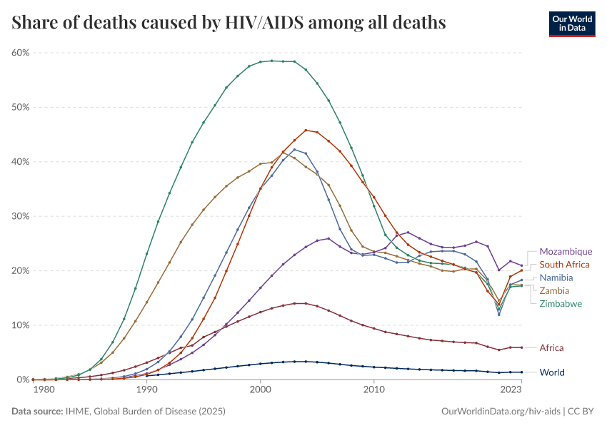 Today, the share of deaths remains high: more than 1 in 5 deaths in some countries are caused by HIV/AIDS. But in the past, this share was even higher.