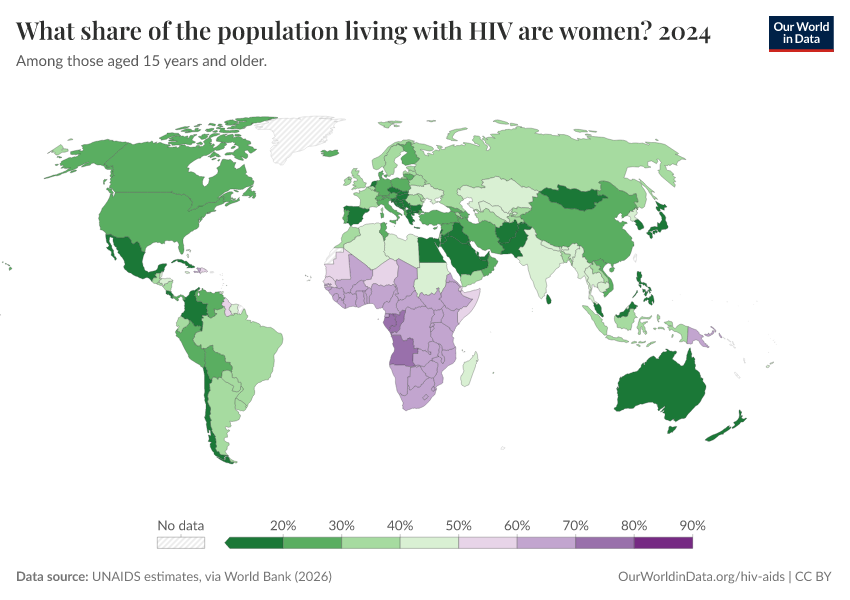 There are differences in the prevalence of HIV and death rates from AIDS between men and women. The chart shows the share of women in populations living with HIV.