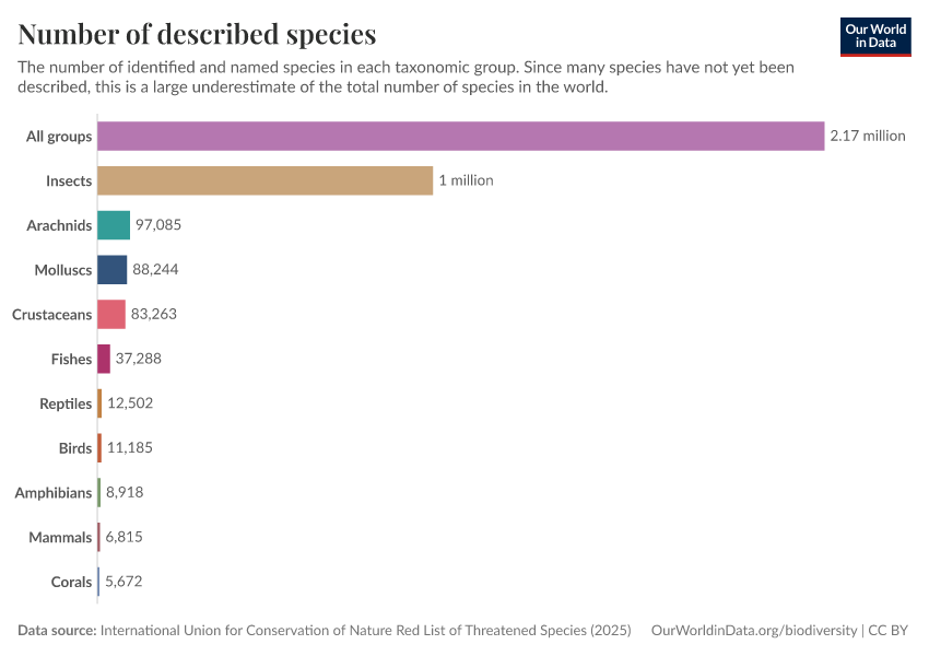 Hannah Ritchie (2022) - “How many species are there?” Published online at OurWorldinData.org. Retrieved from: 'https://data-lexicalindex-indicators.owid.pages.dev:8789/20260106-083806/how-many-species-are-there.html' [Online Resource] (archived on January 6, 2026).BibTeX citation