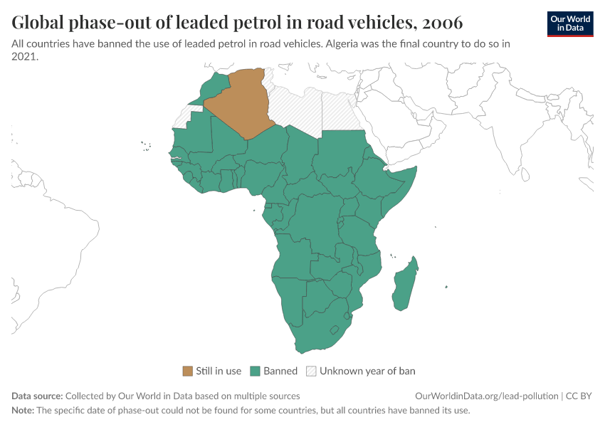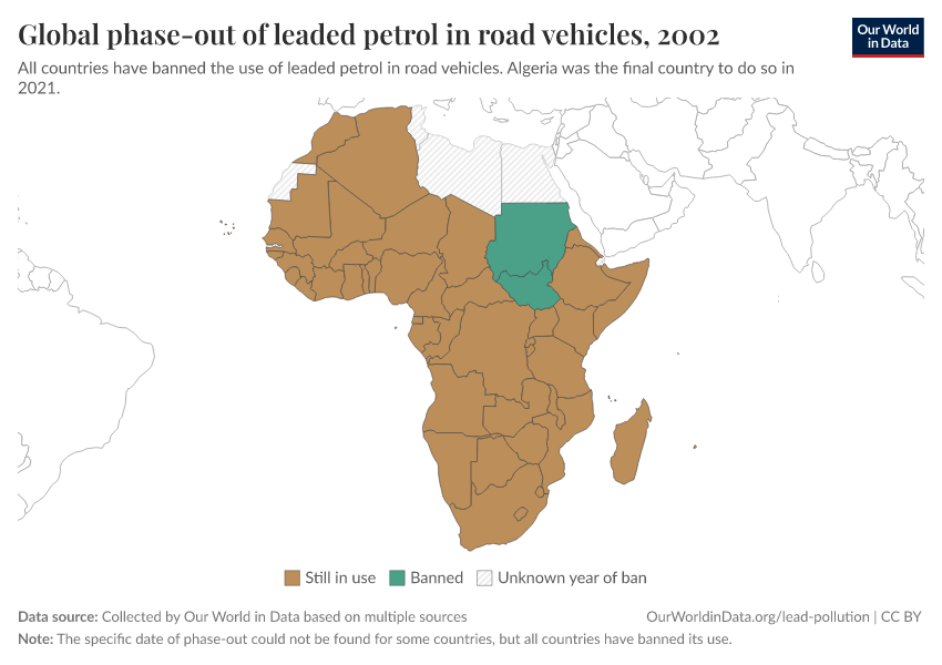 It took long to react, but once the evidence was there and the first country banned it is staggering how quickly some of this progress was made. In 2002, the United Nations Environment Programme (UNEP) launched a programme to eliminate leaded gasoline in road vehicles globally.5 In the map below we see the status of leaded gasoline in Sub-Saharan Africa in 2002. It was still in use in nearly every country. By 2006, it had been banned everywhere in the region. Within only a few years it had been completely eliminated.