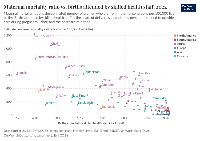 In the first chart, you can see the share of births that are attended by skilled health staff. For most countries this is close to 100%. But there are still some countries where healthcare access is much lower.