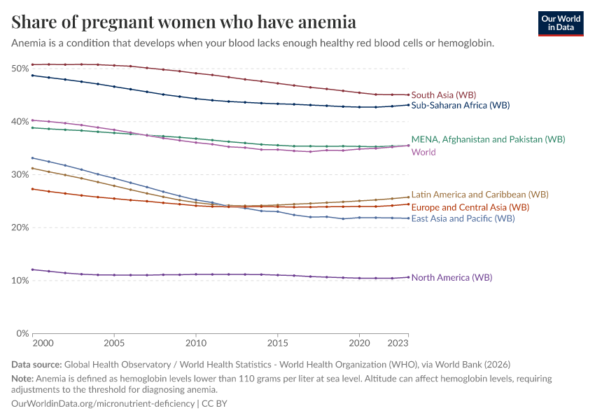 In the chart, we see the prevalence of anemia in pregnant women. Globally, around a third of pregnant women worldwide are anemic.