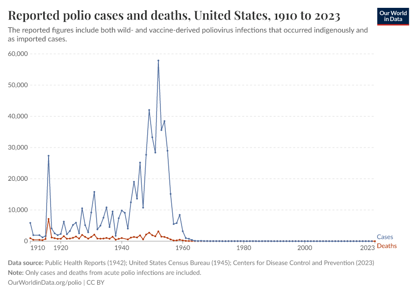 The chart here shows the annual absolute number of reported deaths and cases in the United States over the last century; the corresponding perspective on the rate of deaths and cases is shown in this visualization.