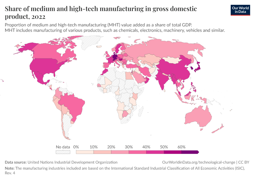 This indicator measures the share of a country's manufacturing value added which is derived from medium to high-tech industry outputs. Higher values indicate that a country's industrial sector is more focused on high-tech manufacturing.